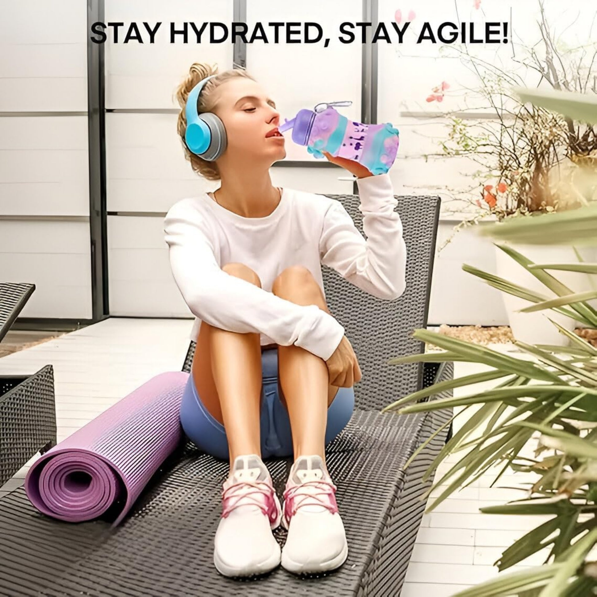 A young woman relaxing after a workout, sitting on a lounge chair with a yoga mat beside her. She is wearing headphones and drinking water from a colorful, portable folding water bottle. The text “STAY HYDRATED, STAY AGILE!” highlights the importance of hydration during fitness activities. This image shows how the bottle is perfect for gym workouts, yoga sessions, and daily fitness routines
